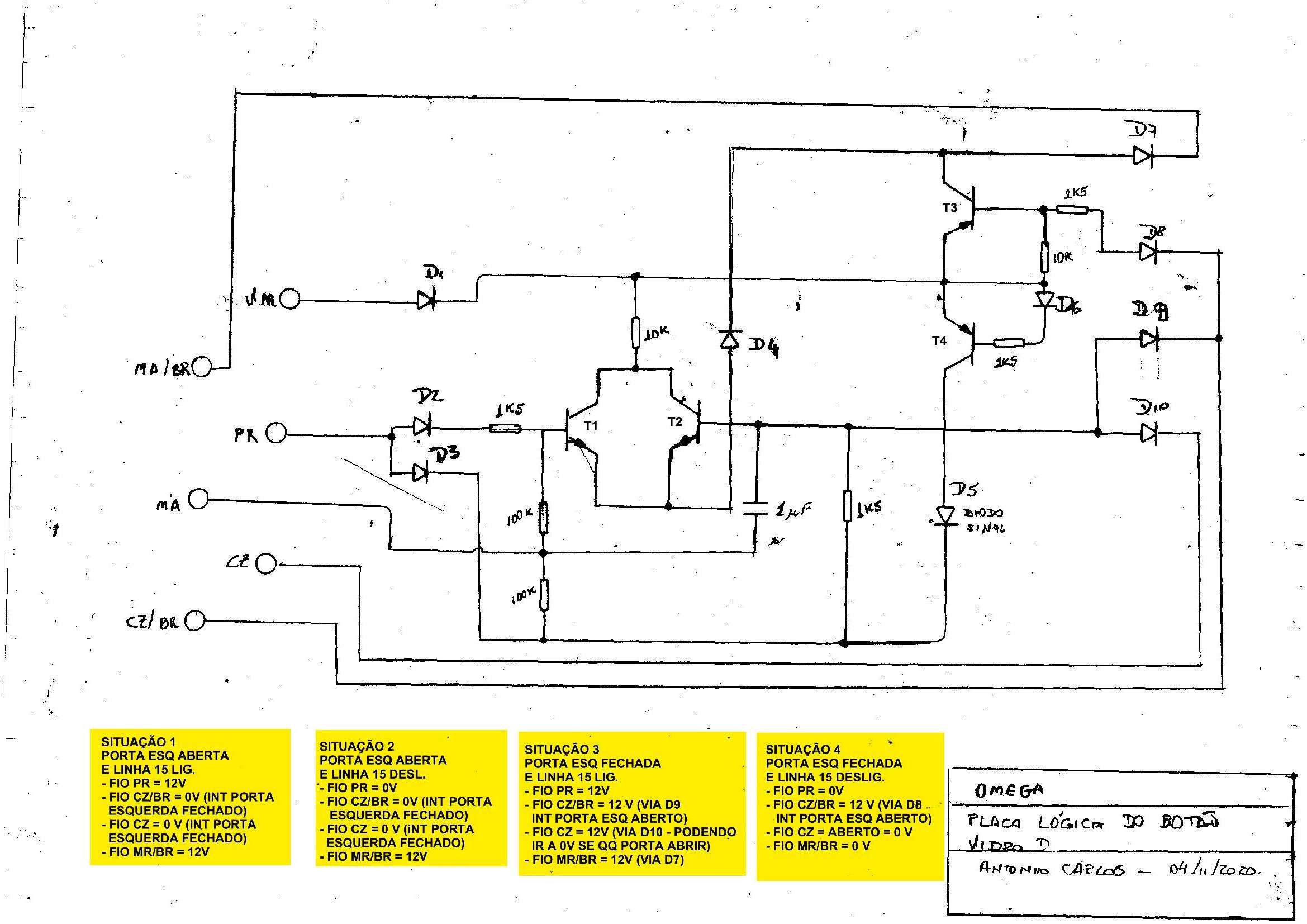 Bom, tentei ver no esquema elétrico que tenho, no que você mandou e no seu vídeo, a cor dos fios que váo até a plaquinha mas não há nenhuma indicação. Só numa ultima tentativa de deixar mais original possível, se for possível e se você tiver anotado, veja se a posição dos fios está correta na plaquinha, pois tinha sinal de que alguém havia retirado anteriormente. Se não funcionar, possivelmente farei algum ckt temporizado para funcionamento (habilitação dos vidros na linha MA/BR). Muito obrigado e desculpe o incomodo.