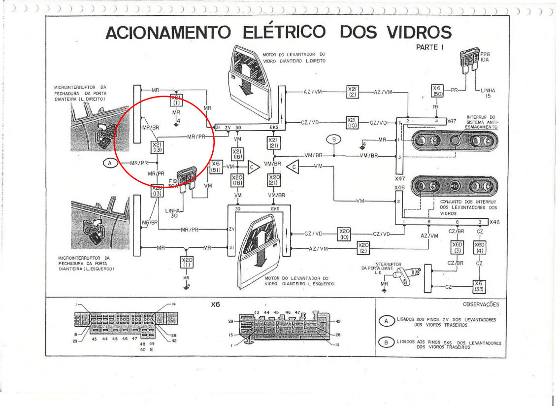 Desculpe... ultima forma.. retirei o interruptor da porta motorista e descobri que trocaram por um interruptor simples. Um dos fios está desligado. Também verifiquei que se eu desligar o fio CZ/BR da plaquinha dos vidros, o ckt funciona e sobe os vidros com linha 15 desligada. Mas algo ainda não está certo, pq me parece que o funcionamento não está muito como você comentou. Já comprei o interruptor correto (duplo) para trocar. Depois postarei resultado.