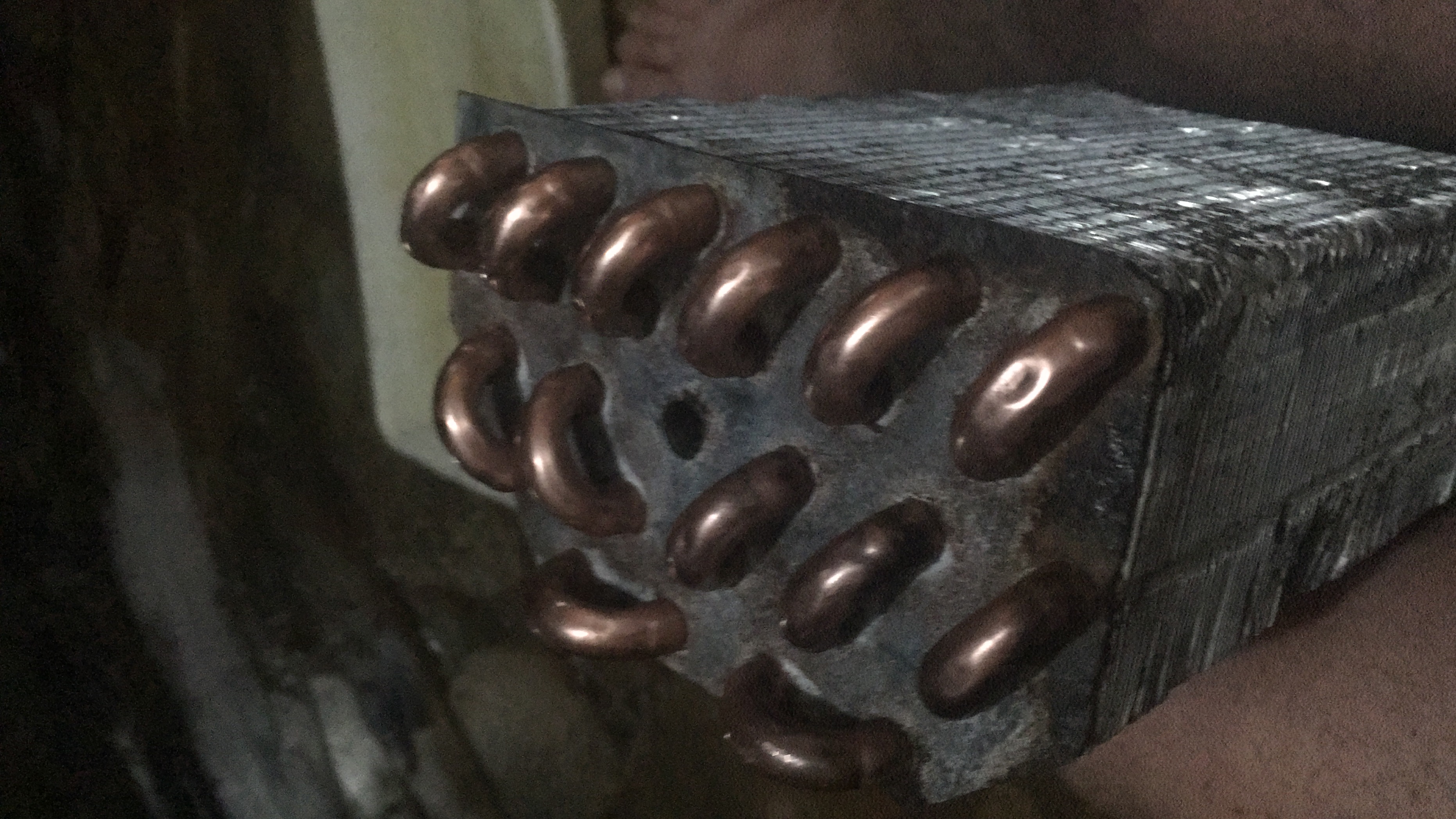 Evaporador removido, tinha alguns indícios de óleo na conexão da corta fogo. Como era muito pouco, acabou ficando inconclusivo se realmente estava vazando ou se a espuma que estava suja.