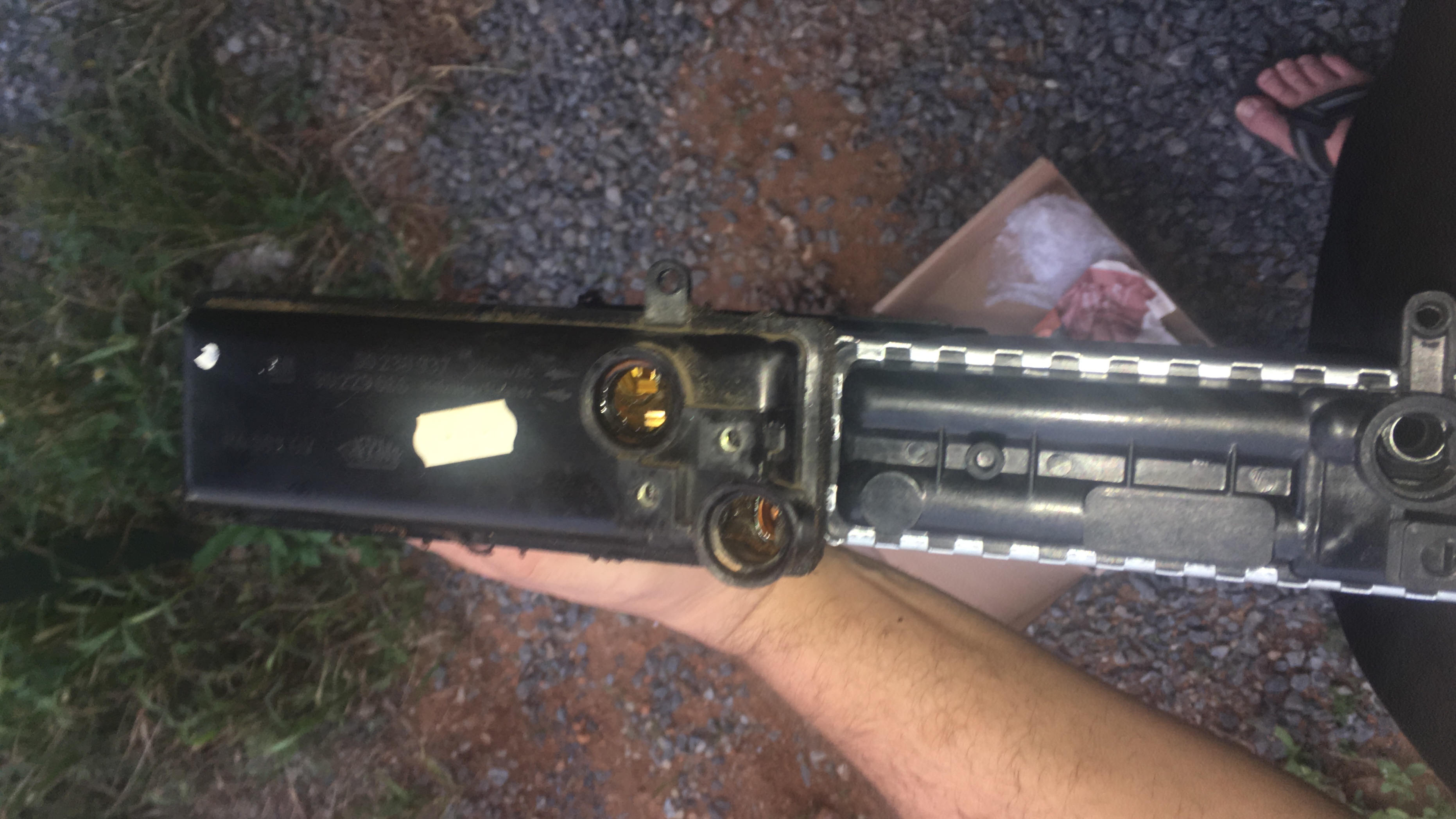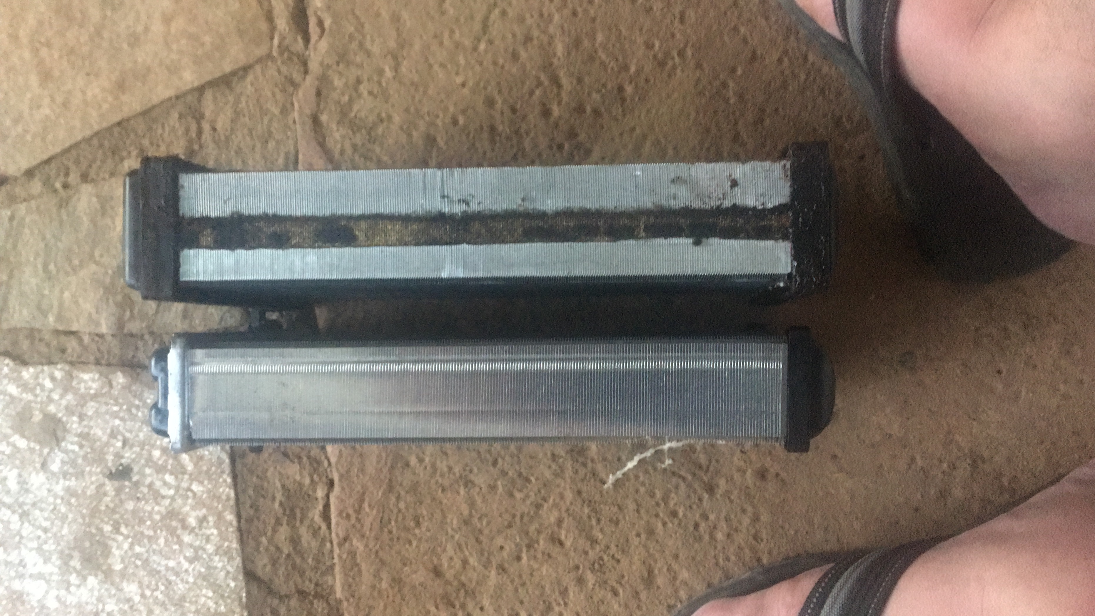 Ao puxar o radiador, de fato não estava maluco ao sentir cheiro de aditivo ao mudar para ar quente.. Tinha um vazamento interno nele e a caixa estava melecada por dentro. Uma pena pois ele estava com aspecto muito novo.