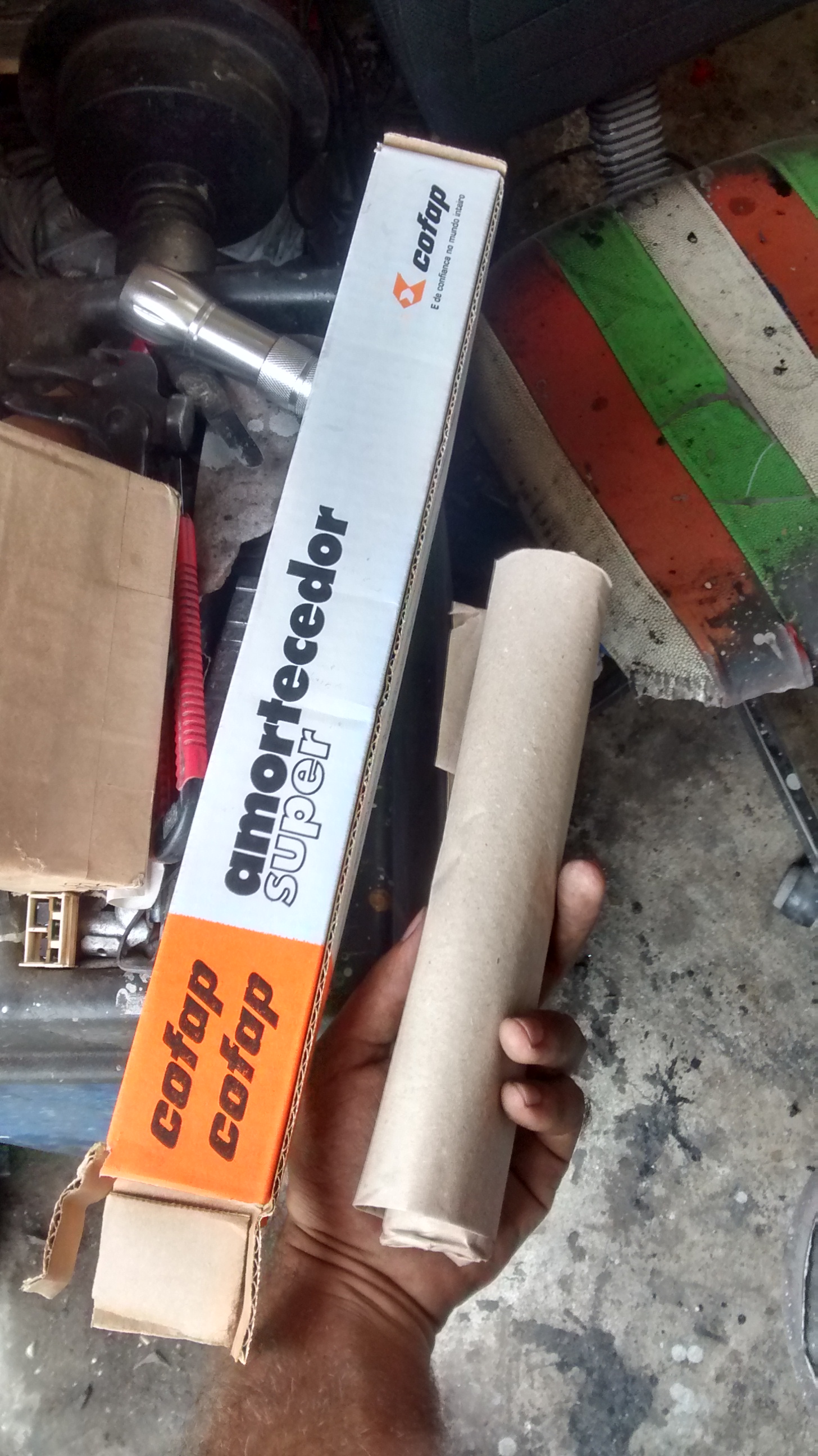 Uns dias depois instalei o amortecedor do motor COFAP. Eu comprei um par, mas só troquei o da esquerda, o outro original ainda estava ótimo.