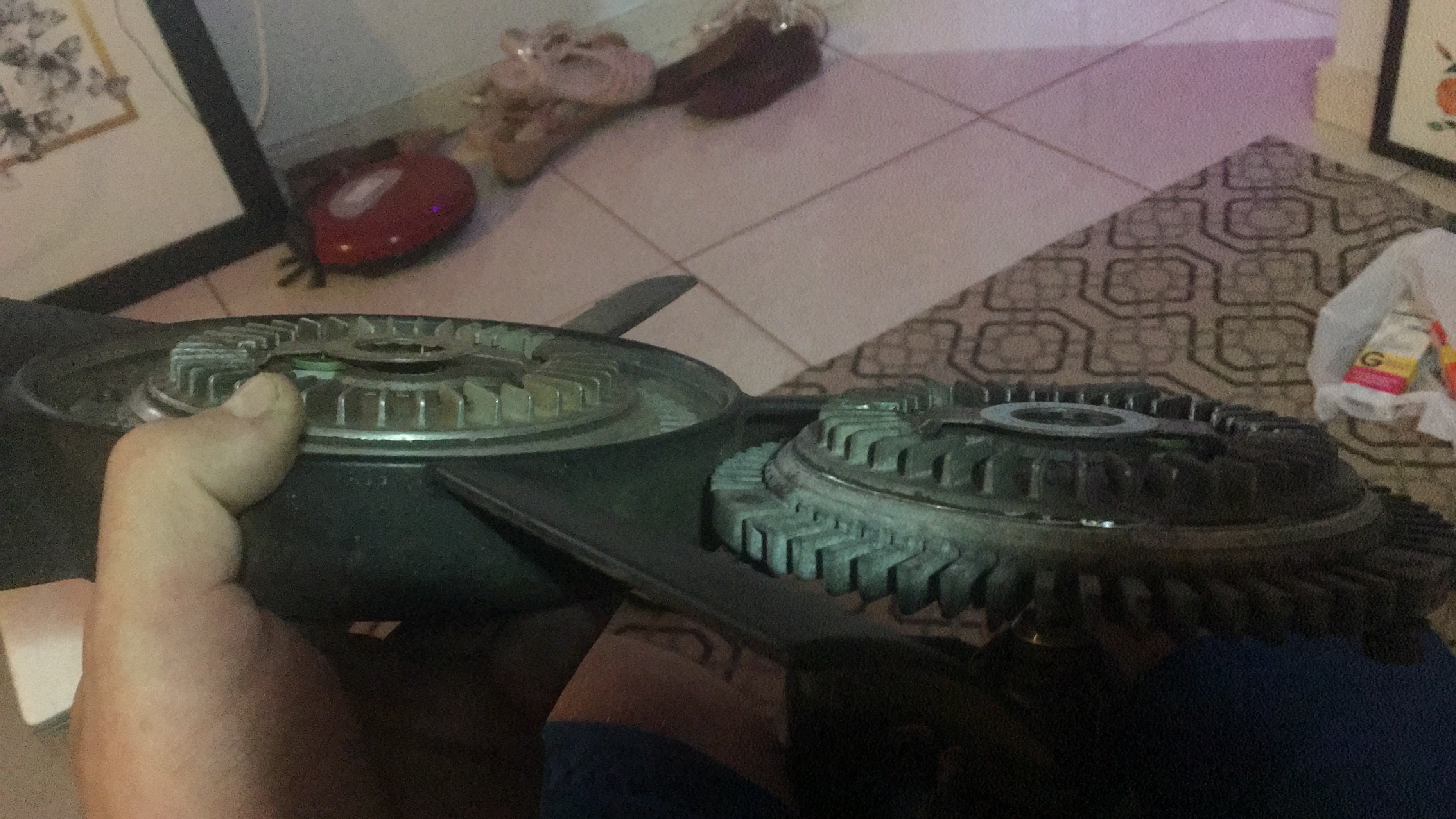 Comparando as duas peças, não poderia ser diferente. Uma baita diferença na espessura da peça. Na caixa, ficava mais folgada que bombacha de palhaço. Tive que fazer várias camadas de fita elastomérica para preencher o espaço.