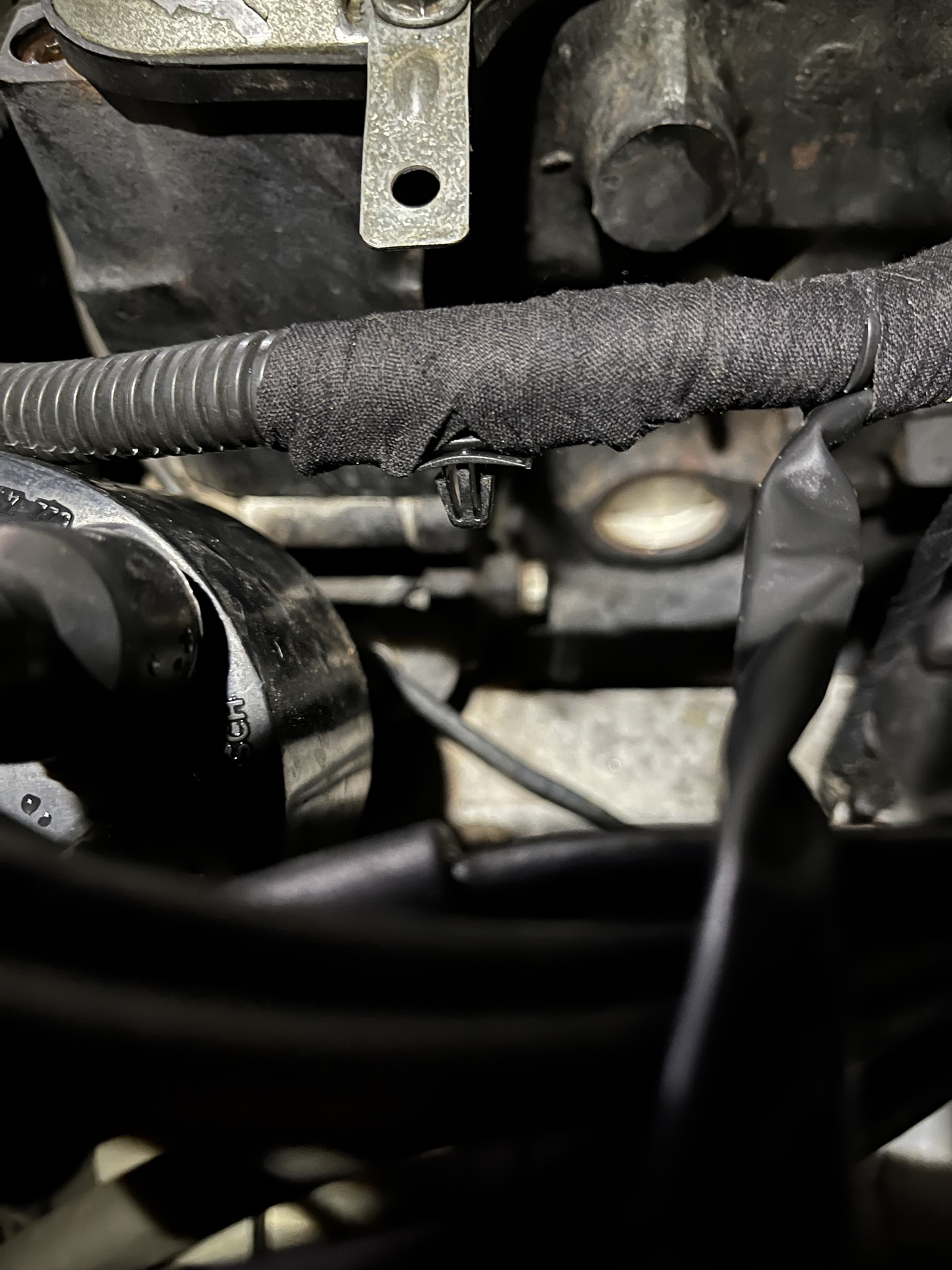 Foi feito a recuperação do chicote do motor (o que conecta bateria, arranque, alternador, sensores de óleo). Usei o chicote novo como gabarito para refazer a fita com as derivações nas posições corretas. O conduíte que envolve os fios do sensor de nivel de óleo foi trocado pois já estava completamente rígido e quebradiço. A fixação do chicote às chapinhas da tampa de válvulas foi feita com as hellerman de encaixe e com a presilha embutida no chicote pela fina, no mesmo padrão de fábrica.